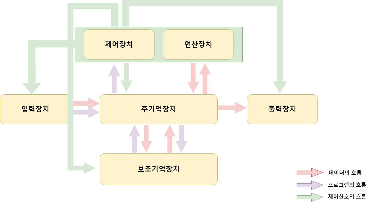 | 중앙처리장치 = 레지스터 + 제어장치 + 연산장치 주변장치 = 입·출력장치 + 보조기억장치 |