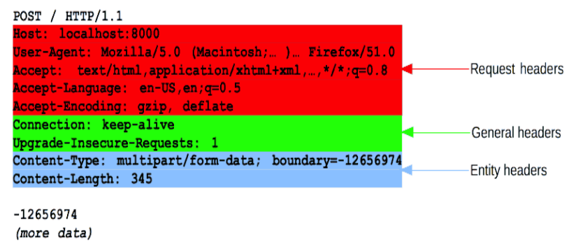 - 다중-리소스 본문(Multiple-Resource bodies) : 멀티파트 본문으로 구성되는 다중 리소스 본문에서는 파트마다 다른 정보를 지니게 됩니다. 보통 HTML 폼과 관련이 있습니다.