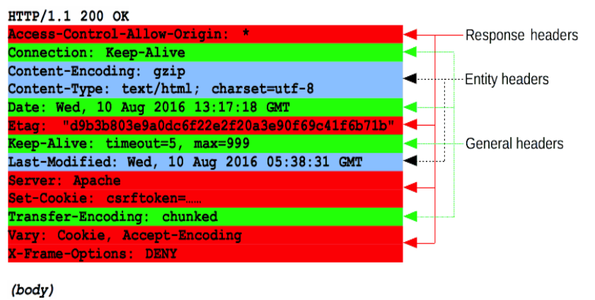 응답에 들어가는 HTTP 헤더는 다른 헤더와 동일한 구조를 따릅니다. 대소문자를 구분하지 않는 문자열 다음에 콜론(':')이 오며, 그 뒤에 오는 값은 구조가 헤더에 따라 달라집니다. 헤더는 값을 포함해 전체를 한 줄로 표시합니다.
