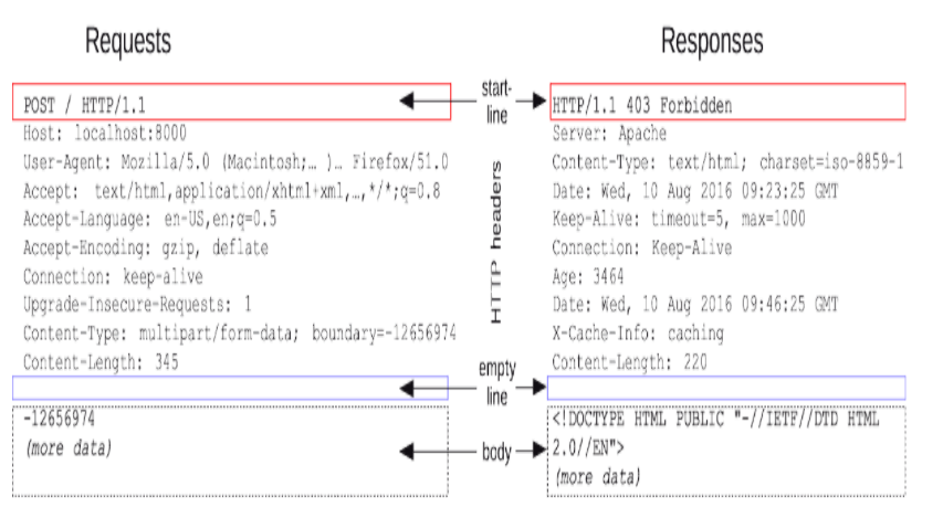 - 시작 줄(Start-line)에는 실행되어야 할 요청, 또는 요청 수행에 대한 성공 또는 실패가 기록 되어 있습니다. 이 줄은 항상 한줄로 끝납니다.