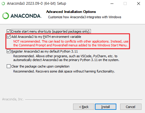 - 기본 경로(C:\Users\[사용자명]\anaconda3)에 설치